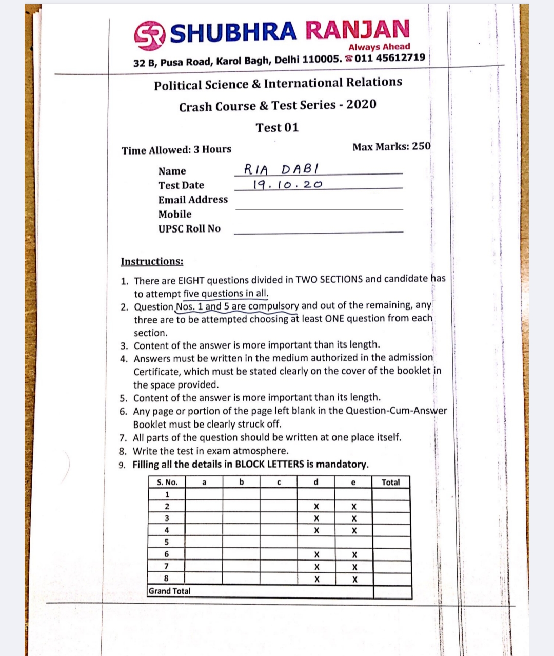 TOPPER(RIA DABI AIR-15) Political Science Answer Booklet Compilation IAS-2020 by Shubhra Ranjan IAS